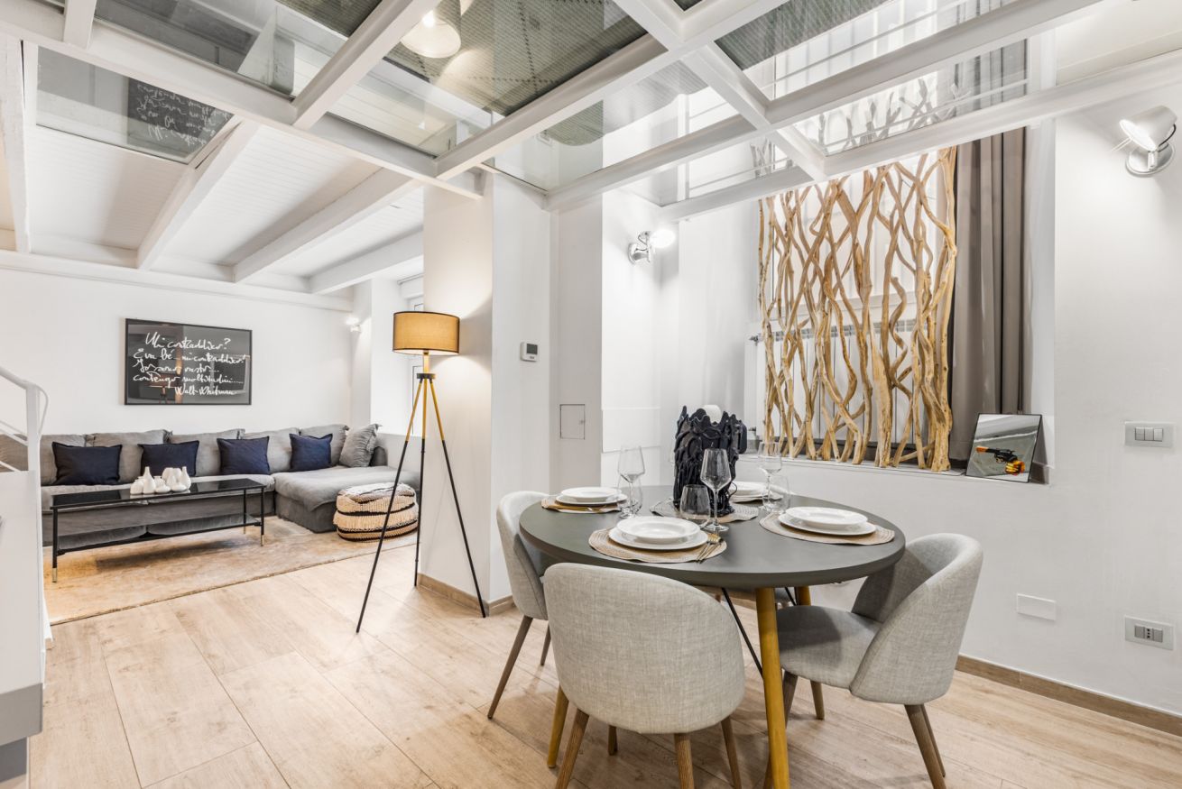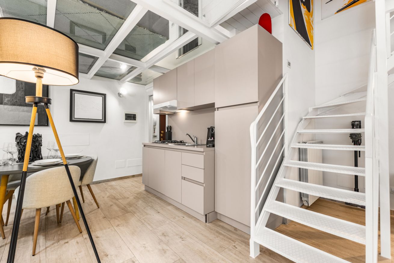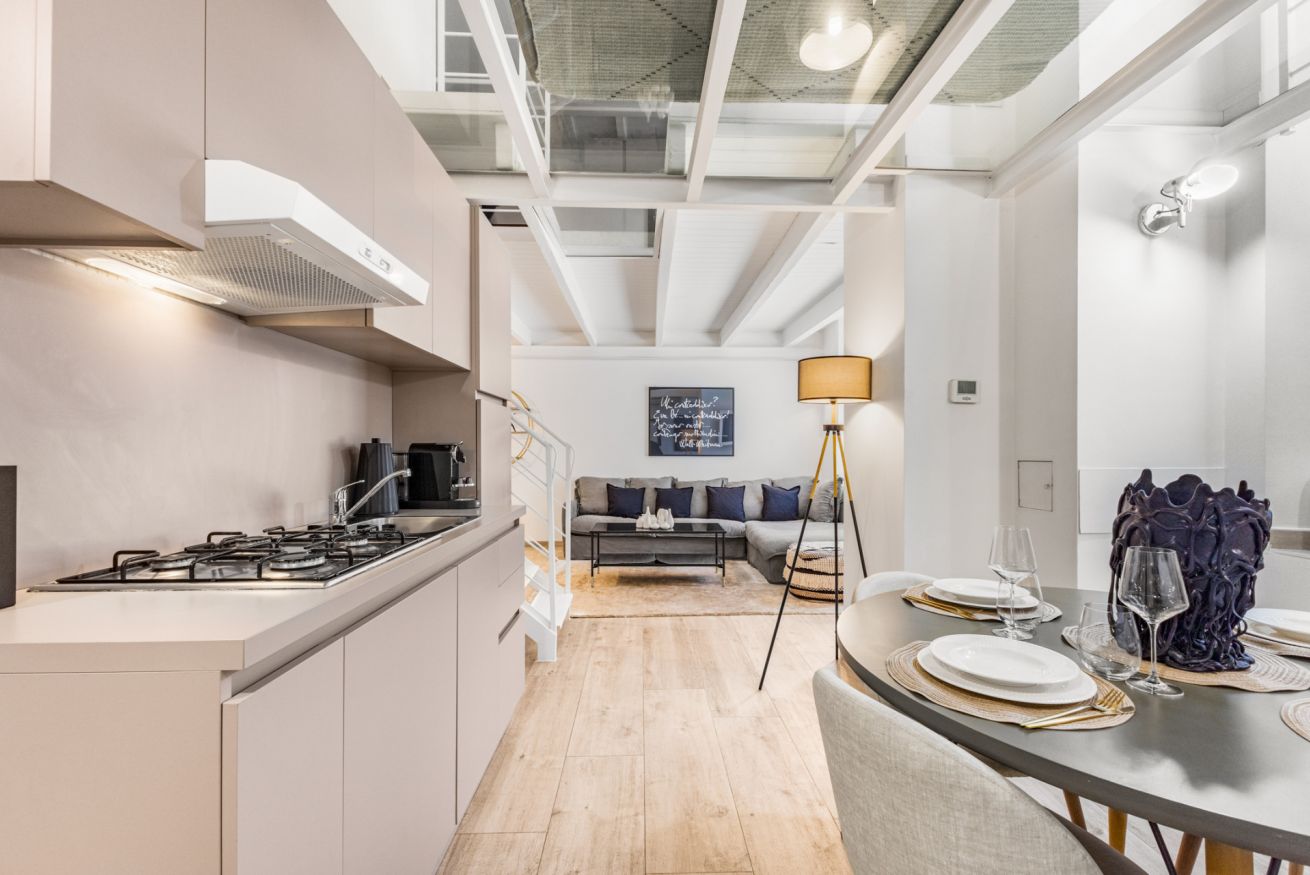L’appartamento si distingue per il suo stile moderno e ricercato, con spazi ampi e ben distribuiti. Al piano terra si trova la zona giorno con cucina a vista completamente attrezzata, dotata di macchina del caffè, microonde, bollitore e tutto il necessario per cucinare. Il living è arredato con un ampio e comodo divano letto e Smart TV, ideale per momenti di relax.