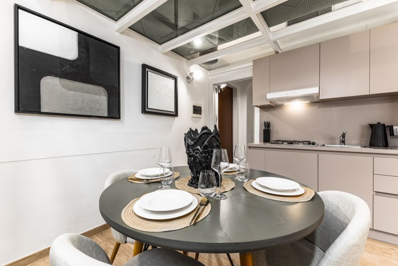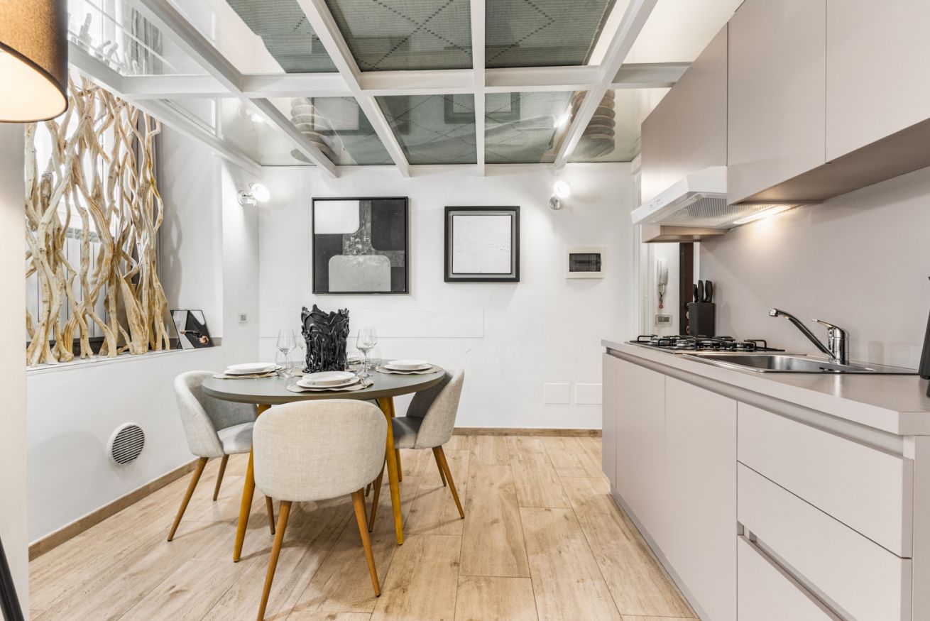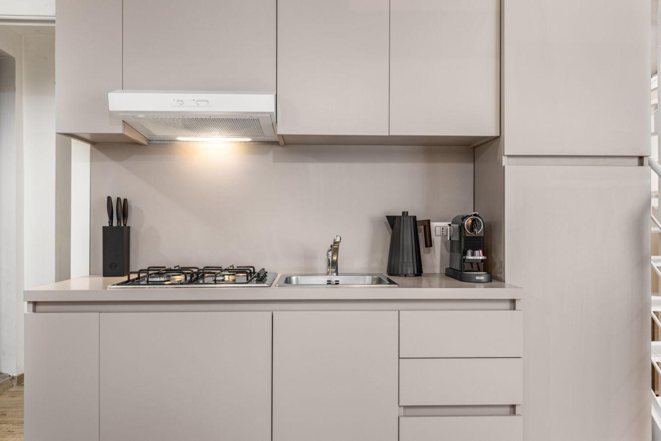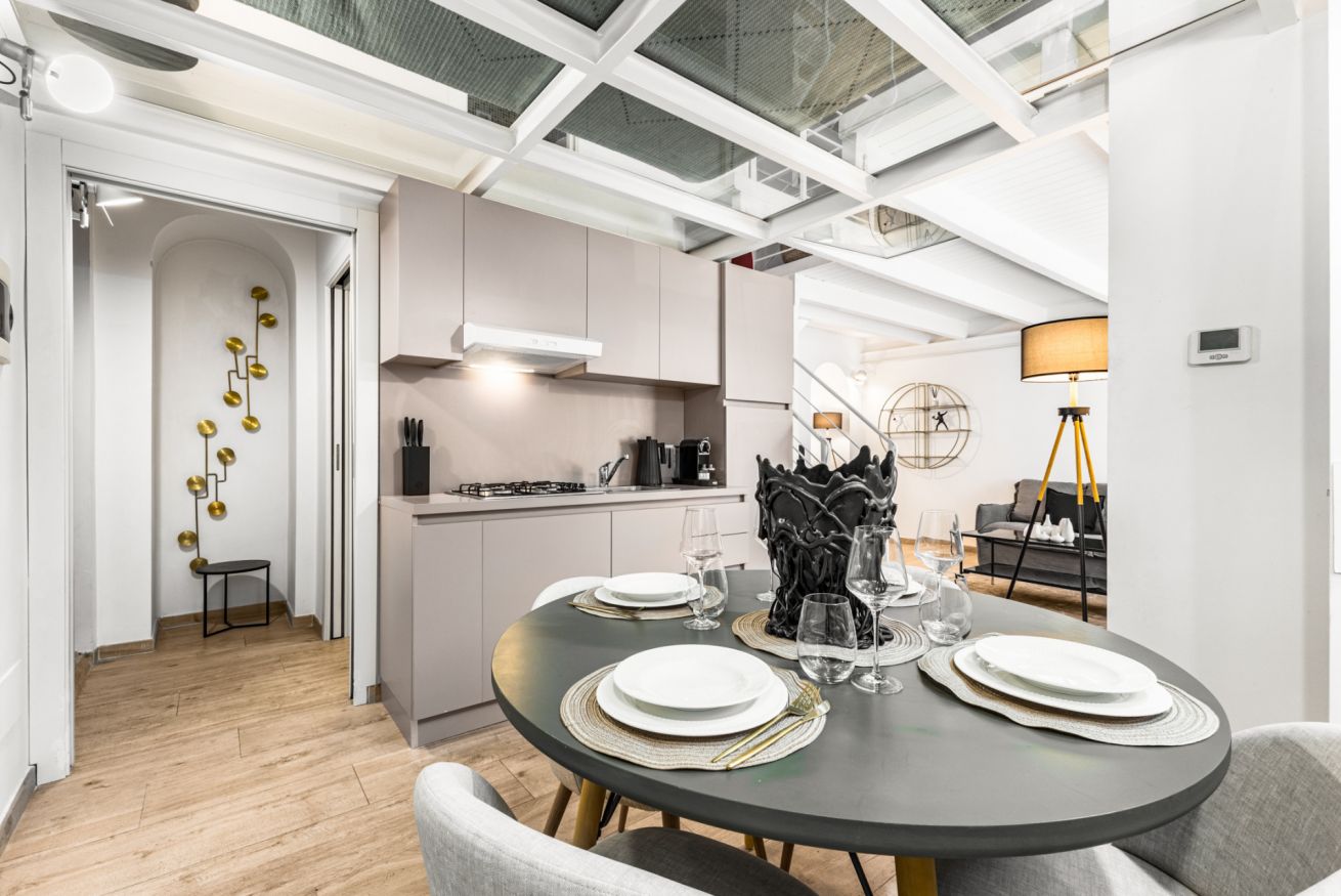 L’appartamento si distingue per il suo stile moderno e ricercato, con spazi ampi e ben distribuiti. Al piano terra si trova la zona giorno con cucina a vista completamente attrezzata, dotata di macchina del caffè, microonde, bollitore e tutto il necessario per cucinare. Il living è arredato con un ampio e comodo divano letto e Smart TV, ideale per momenti di relax.