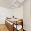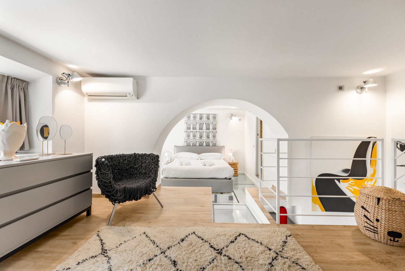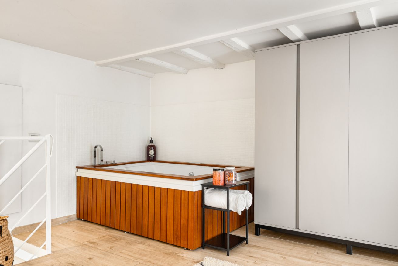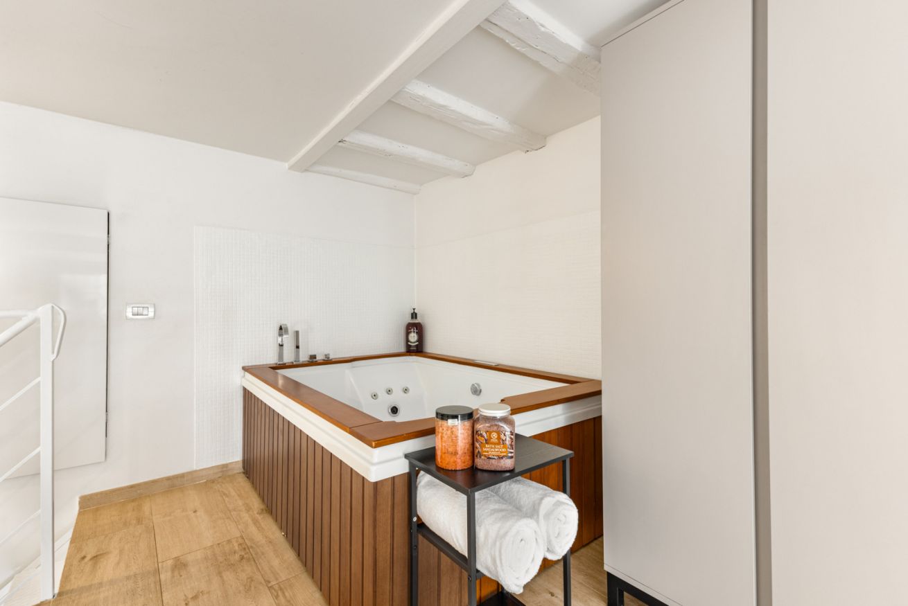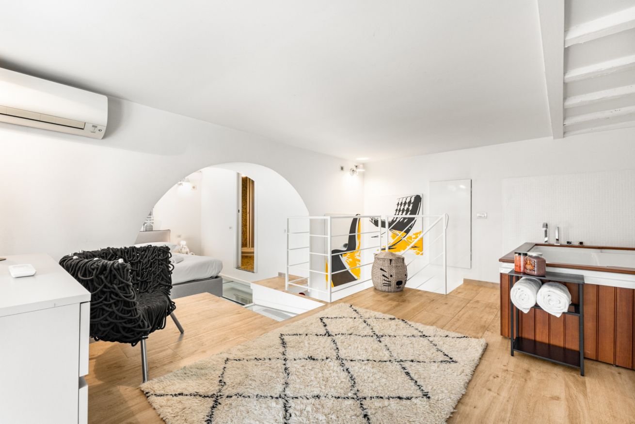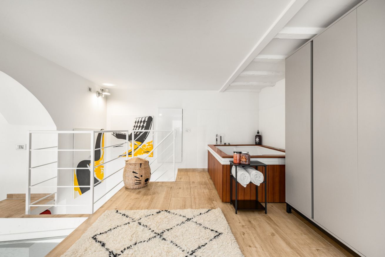 Al livello superiore si sviluppa la zona notte, pensata per offrire un’esperienza esclusiva: qui si trova un elegante letto matrimoniale, armadi a parete e una vasca jacuzzi che rende l’ambiente unico e perfetto per rilassarsi. È presente anche un secondo bagno privato con doccia.