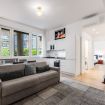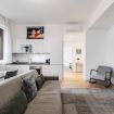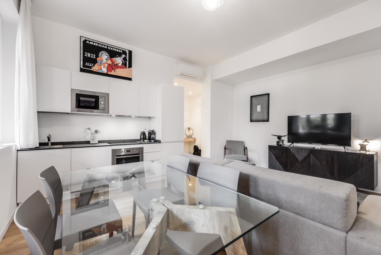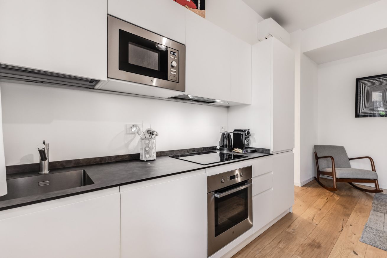 La zona living con una nuovissima cucina a vista completamente accessoriata dotata di frigorifero con freezer, piano a induzione, lavastoviglie e macchina del caffè.
