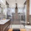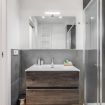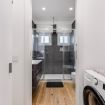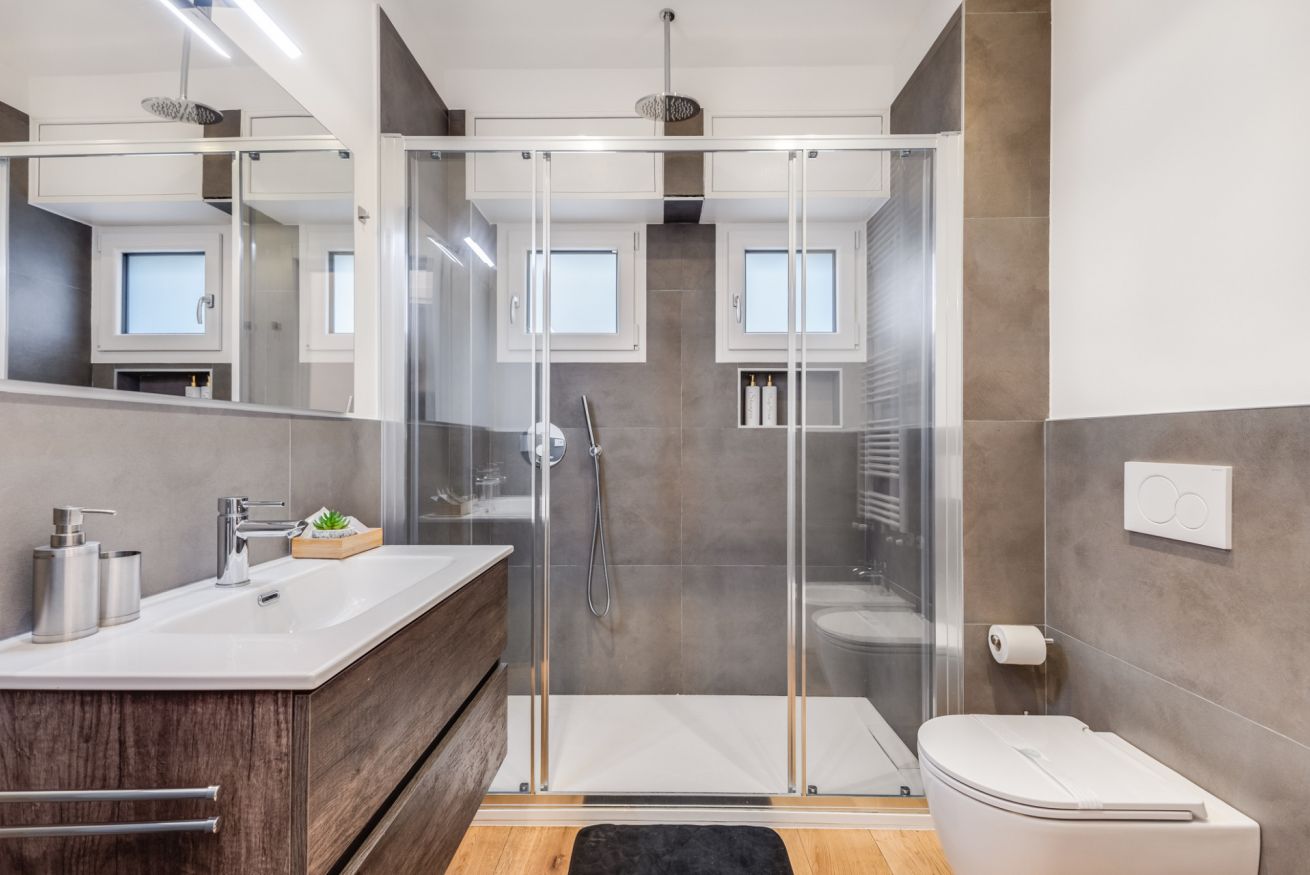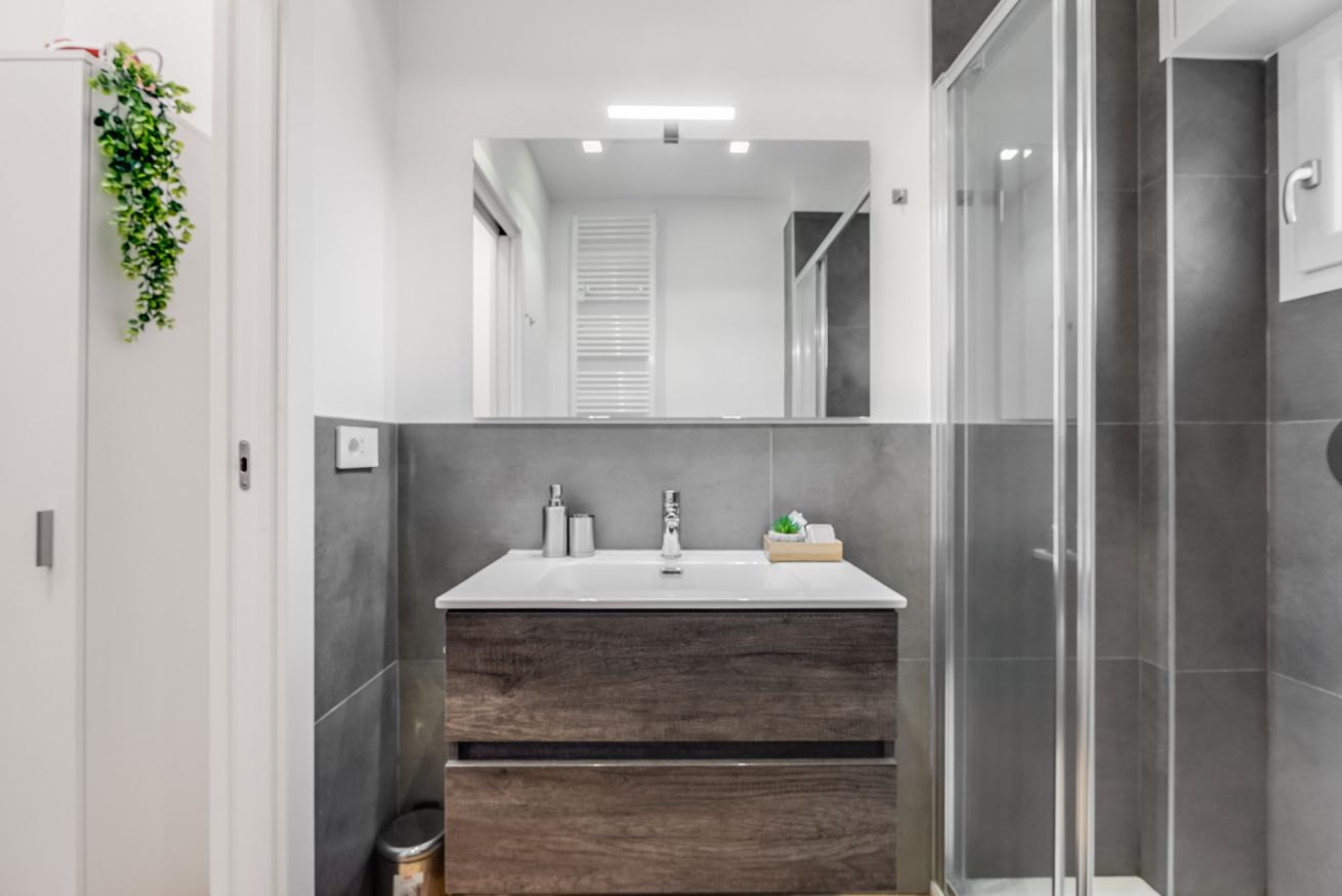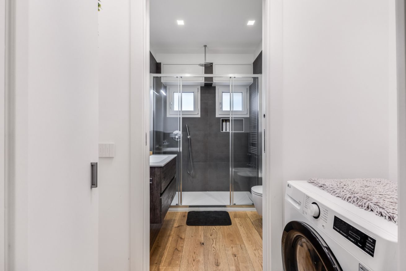 Bagno con materiali di pregio, lavabo di design, doccia emozionale, angolo lavatrice.