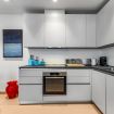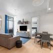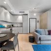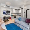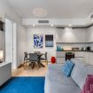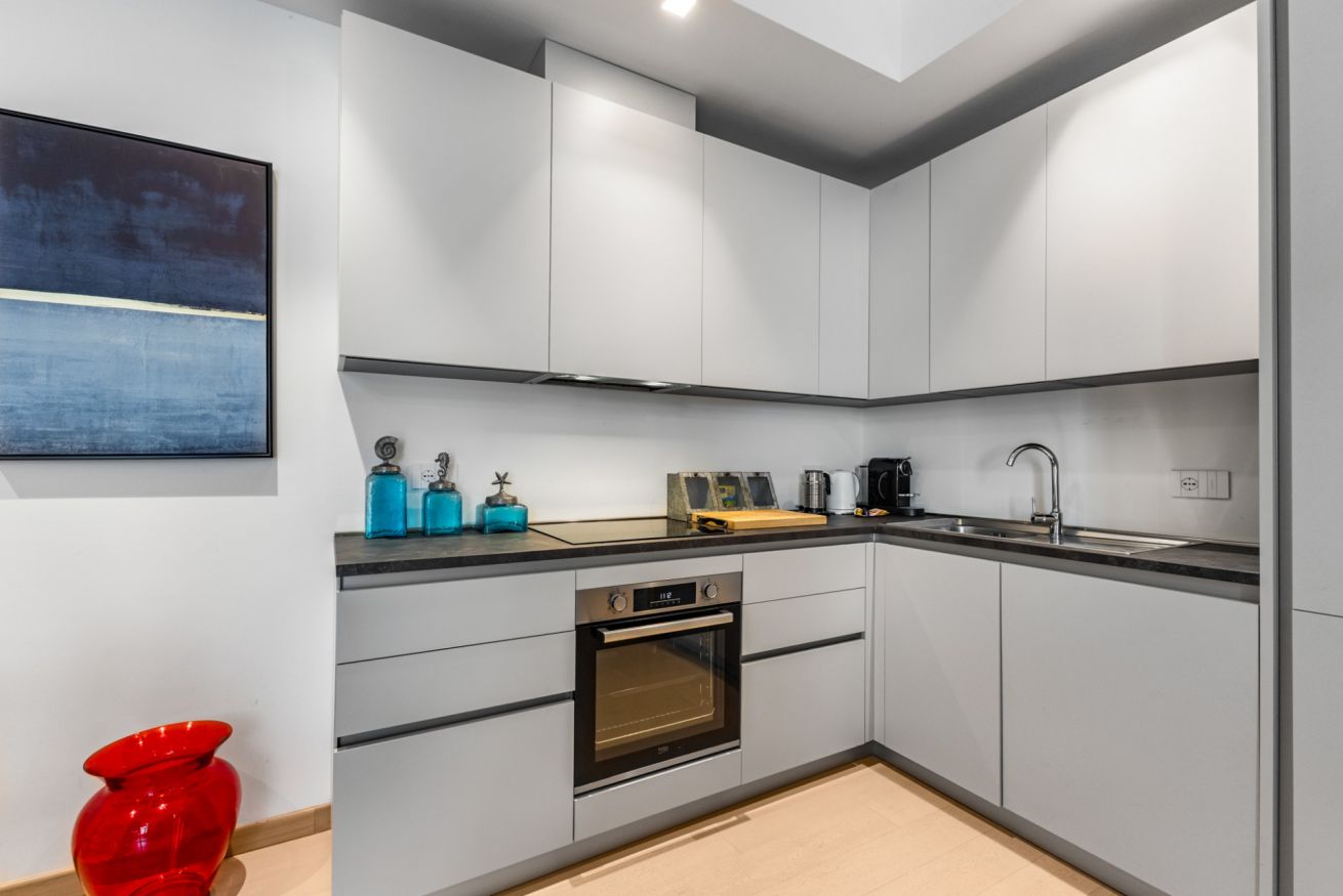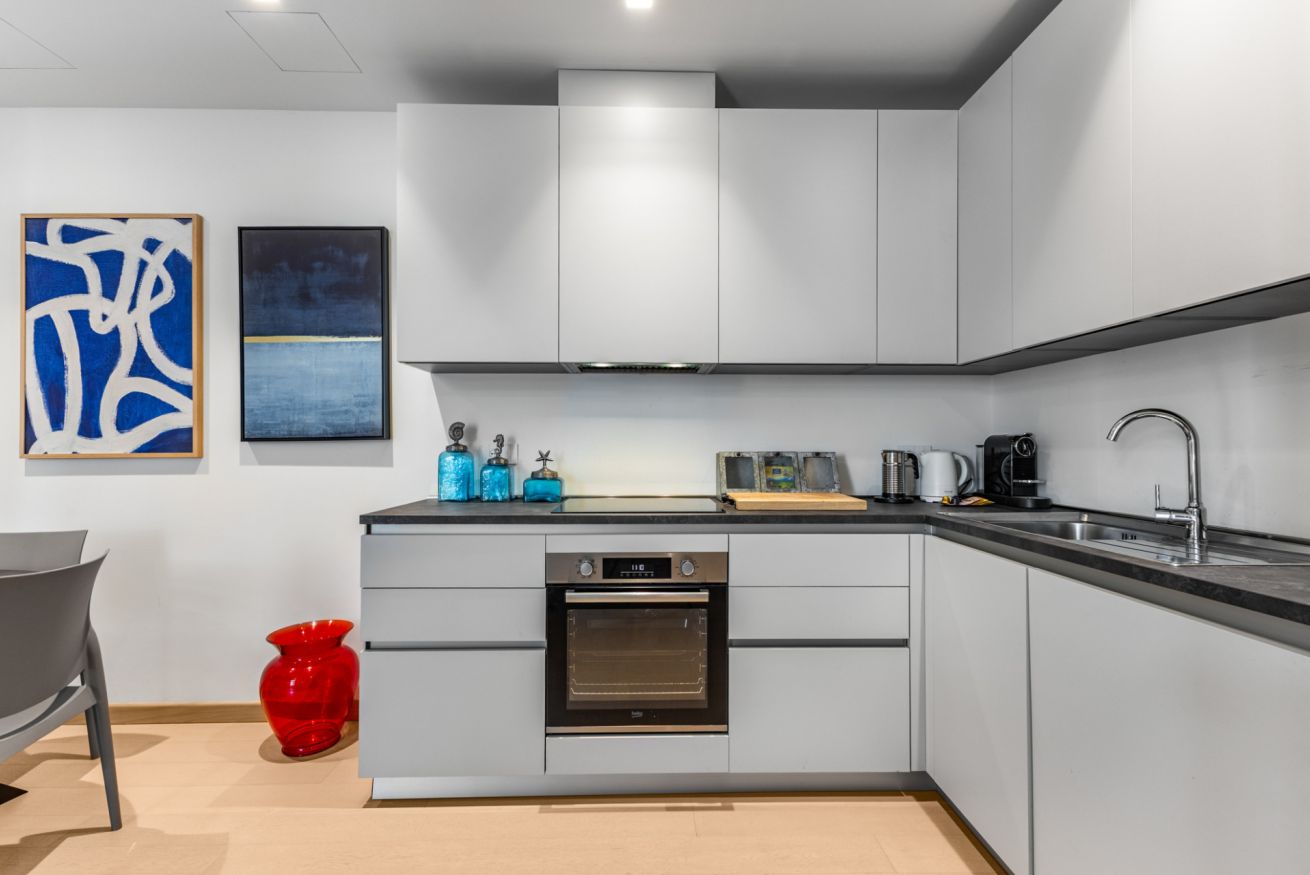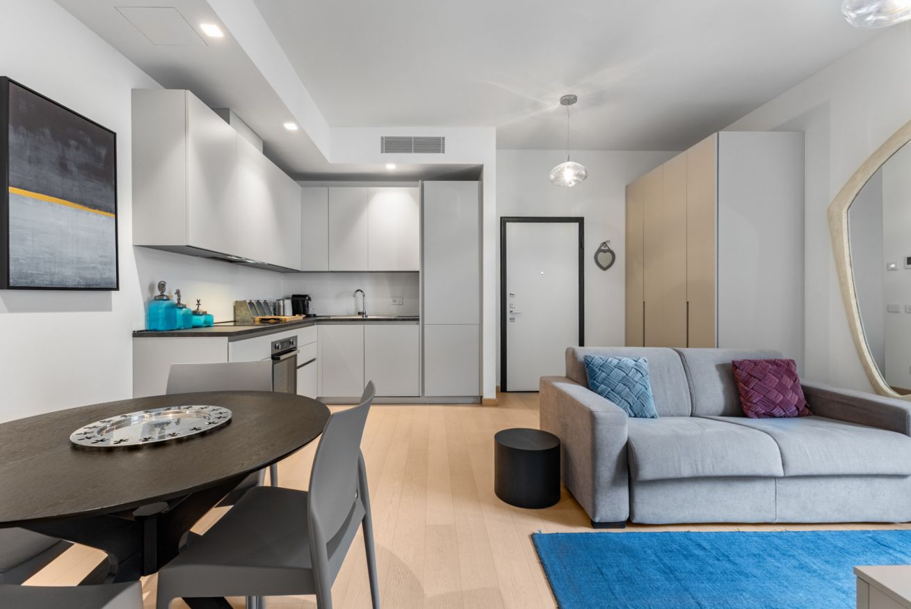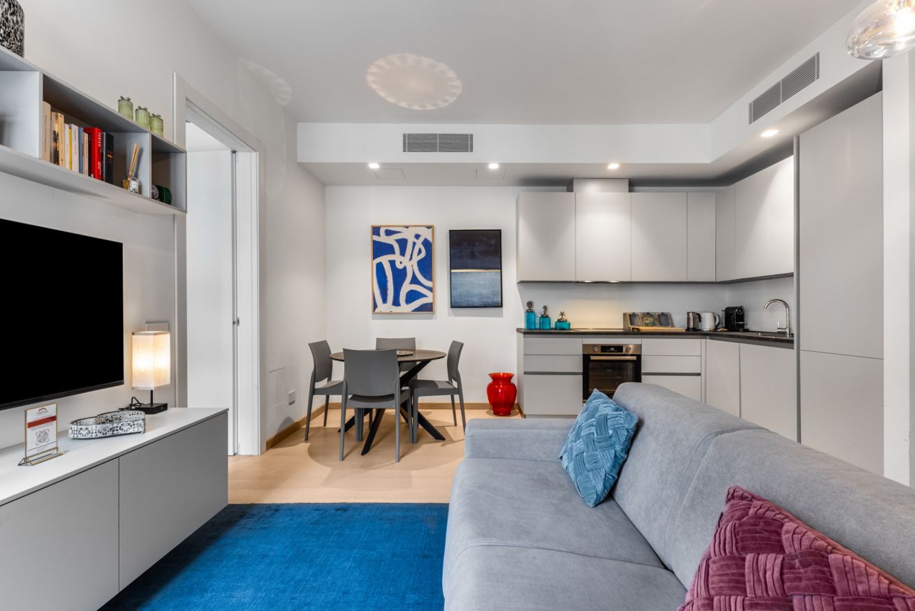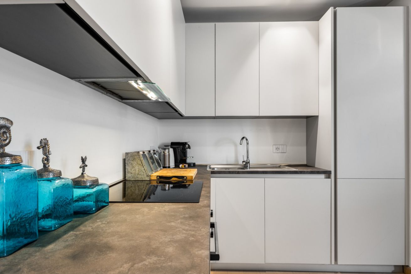 La zona living con una nuovissima cucina a vista completamente accessoriata dotata di frigorifero con freezer, piano a induzione, lavastoviglie e macchina del caffè.