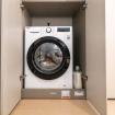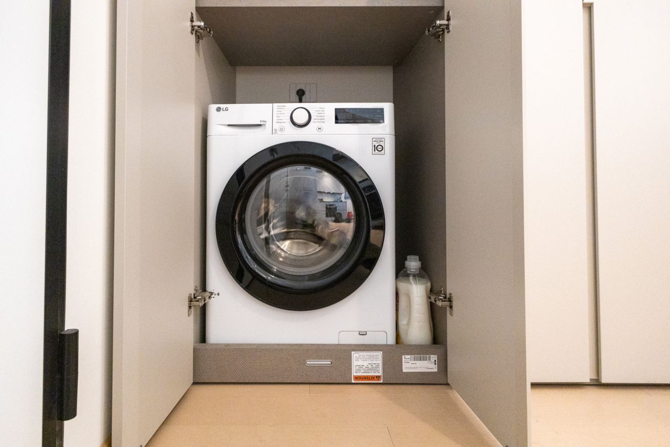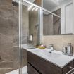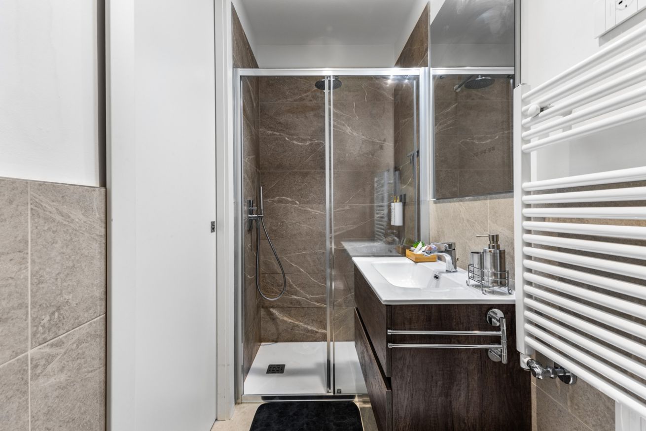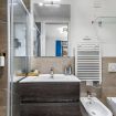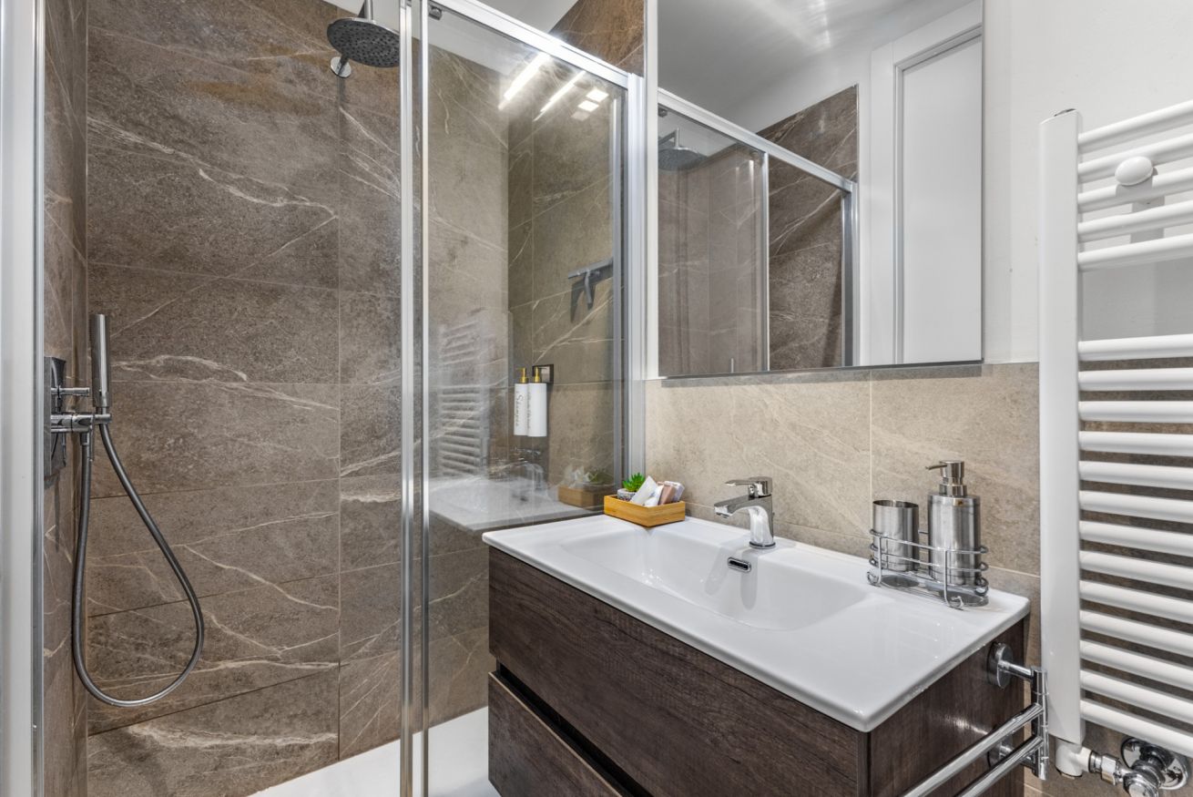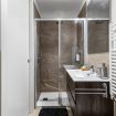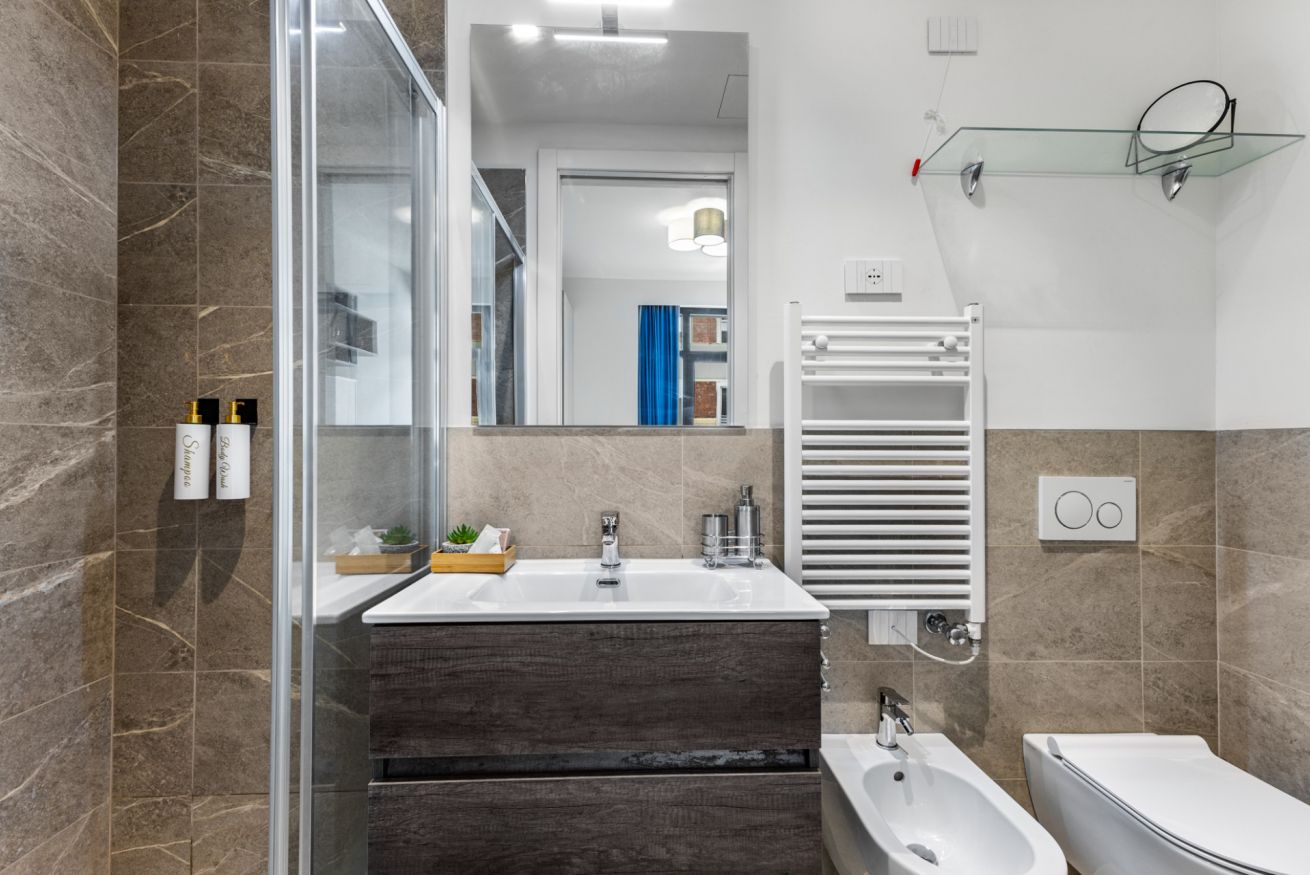 Bagno con materiali di pregio, lavabo di design, doccia emozionale, angolo lavatrice.